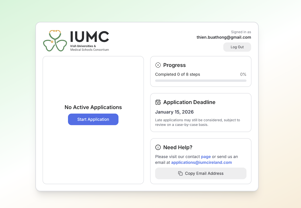 Admissions platform enabling 300+ international students to apply seamlessly to Irish medical and dental universities, replacing manual paperwork with a fully online process.